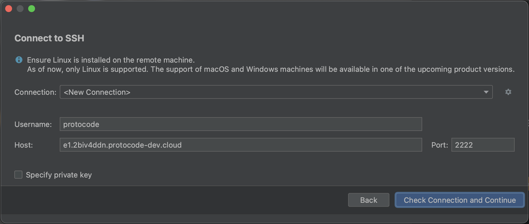 Au clic sur l'un des IDEs de la suite, une modale s'ouvre pour afficher que l'IDE sélectionné est en cours d'installation. Cela prend généralement moins d'une minute. Ensuite, une fenêtre de JetBrains Gateway s'ouvre pour confirmer les éléments de la connexion SSH. Cliquez sur "Check connection and Continue".